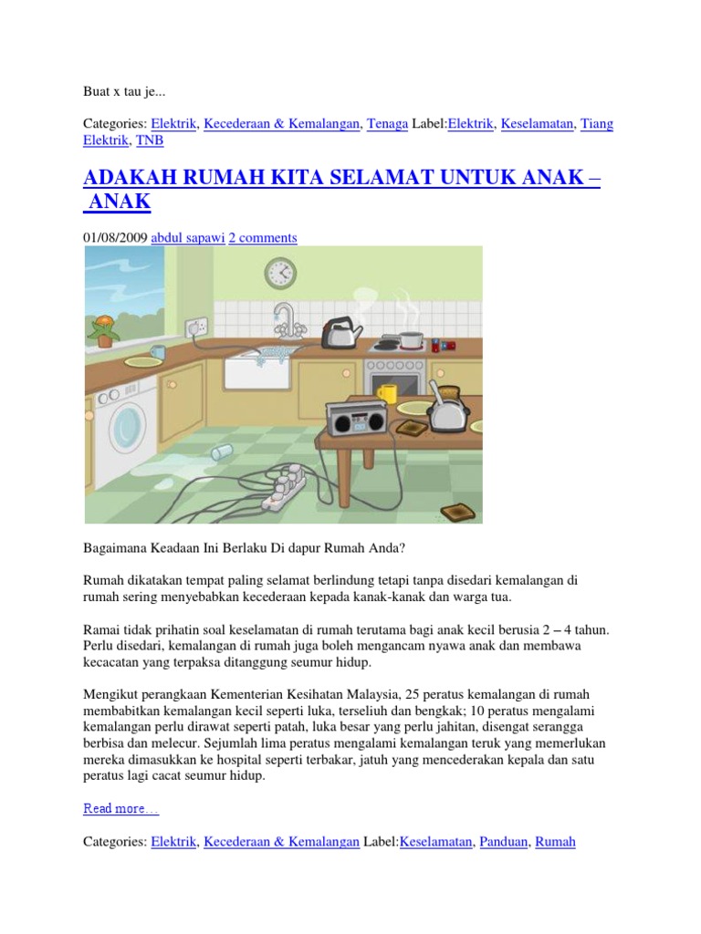 1 Kemalangan di rumah a Terkena air panas b Jatuh di padang 2 Kemalangan di rumah a Renjatan elektrik b kemalangan jalan raya 3 Kemalangan di rumah a luka terkena pisau b luka terkena jalan raya 4 Kemalangan di rumah a lemas di dalam tandas b lemas di sungai 5 Kemalangan di rumah a jatuh tangga b jatuh gelongsor 6 Kemalangan di sekolah a jatuh. Langkah-langkah keselamatan yang perlu diambil untuk mengelakkan kemalangan di rumah adalah. Sememangnya tenaga elektrik yang digunakan sangat banyak dan duit untuk membayar bil mengalir laju.
