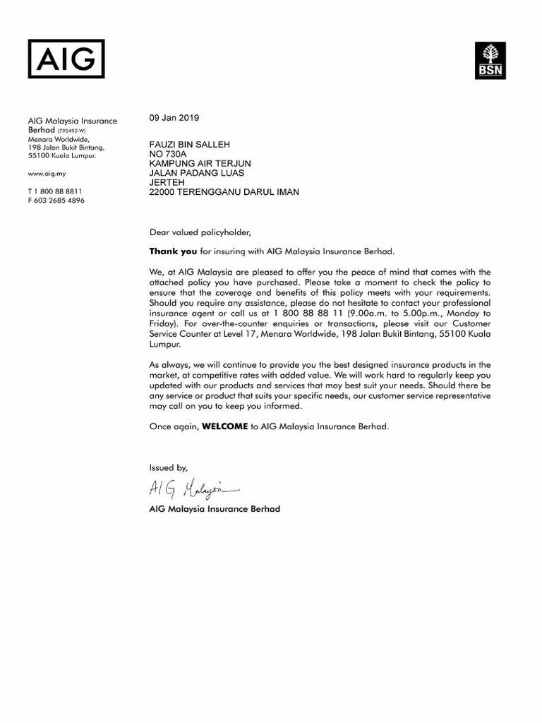 1 AIG Malaysia Insurance Berhad 795492-W Bahagian Tuntutan Tingkat 16 Menara Worldwide 198 Jalan Bukit Bintang 55100 Kuala Lumpur Malaysia Telephone. C Elaun Hospital sehingga RM7000.